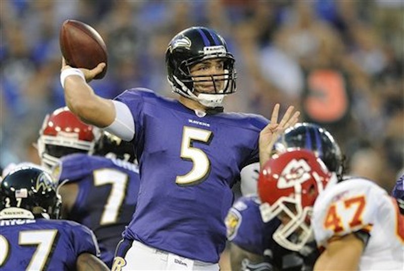 The Baltimore Ravens scored an ugly preseason victory against Kansas City on Friday night. The Ravens first team offense was on the field for much of the first half and mustered just 10 points. I'm not one to be concerned about pre-season results but the sight of Joe Flacco running for his life was both encouraging and worrisome.