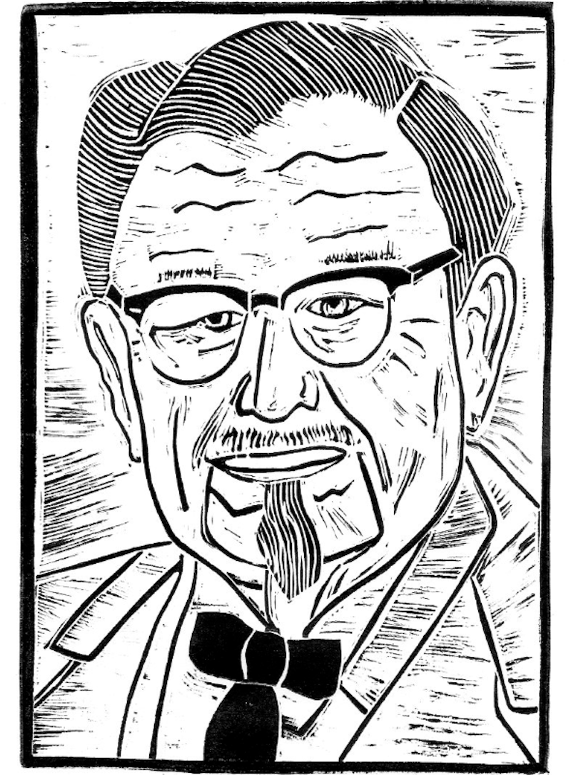 Though his karma is stained with the blood of generations of innocent poultry, Colonel Harland Sanders is an American legend. He may look like a beady-eyed, mint-julep-swilling racist, but his story is quite inspirational. He had a small service station in Corbin, Kentucky when he began cooking for hungry travelers who stopped in for gas. When he was 62, a new interstate highway snatched away his restaurant traffic. With nothing but a $105-a-month Social Security check and a secret recipe for fried chicken, Sanders sought to reinvent himself.
