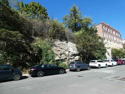Exposed cliffs, made of schist, occur frequently in this part of the city, such as here on Cooper St. in Inwood They’re a legacy of the great glaciers that descended from the north during the last ice age and stopped at about the middle part of Long Island. Rock outcroppings that dot Manhattan and the Bronx are left over from the days when woolly mammoths and spear-carrying Cro Magnons ruled the area.