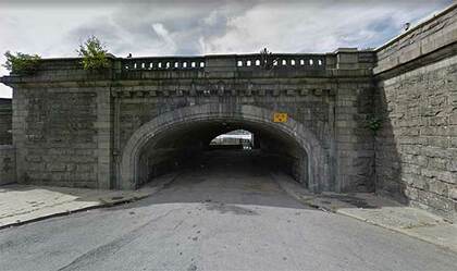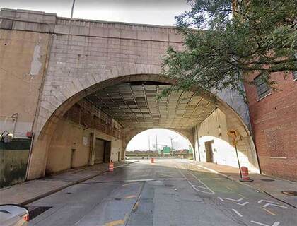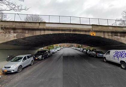 Staying with W. 155th, over the years I’ve become familiar with the W. 155th St. Riverside Dr. viaduct; to the immediate the left is the main entrance to Uptown Trinity Cemetery, as its own designers failed to place the entrance on Broadway, the most logical spot. Just inside the entrance is the gravesite of Clement Clark Moore, the composer of “A Visit From St. Nicholas.” This is something of an Underpass to Nowhere, since at the other end is a somewhat rickety pedestrian bridge spanning railroad tracks.