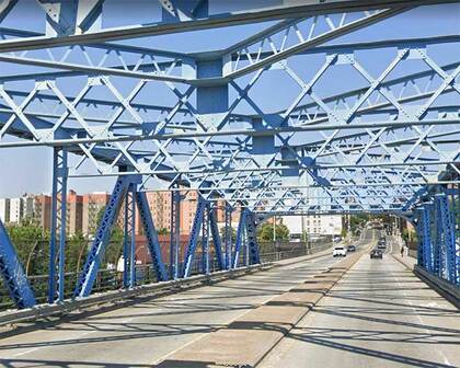 While bumbling about the West Farms area a few years ago I was surprised to happen upon this trestle bridge taking E. 174th above the Bronx River at Starlight Park. I knew there had to be a bridge, but was surprised to see all this glorious metalwork. Blue-painted bridges are a feature in the Bronx, though blue’s also used in other boroughs.